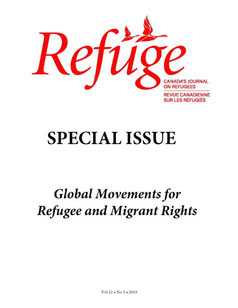 - Michelle Lowry and Peter Nyers. 2003. ‘Introduction: Global Movements for Refugee and Migrant Rights’, Refuge: Canada’s Periodical on Refugees 21:3, pp. 1-3.